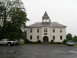 The Hydeville School stands in the village of Hydeville in western Castleton. It is set on the south side of Route 4A, between School Street and Blissville Road. It is a two-story wood frame structure, with a hip roof, clapboard siding, and a slate foundation finished in concrete. The most prominent feature is a projecting three-story tower, which has pilastered corners, the main entrance set in a round-arch opening, and an open belvedere beneath a flared pyramidal roof. The interior retains significant amounts of original finish, including woodwork in the stairwells and classrooms.[2]