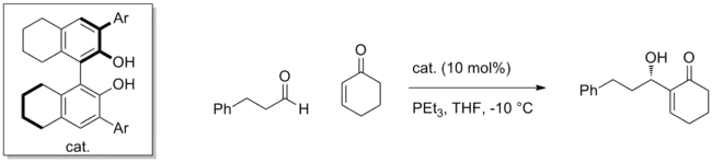 Many synthetic catalysts have been able to successfully employ this strategy to activate a variety of electrophiles. Using a chiral BINOL catalyst, for instance, the Morita-Baylis-Hillman reaction involving the addition of enones to aldehydes can be effected with high enantioselectivity.[5] The nucleophile is an enolate-type species generated from the conjugate addition of PEt3 to the enone, and adds enantioselectively to the aldehyde coordinated to catalyst.