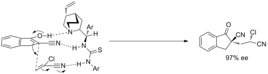In addition to carbonyls, other electrophiles such as imines can be successfully used. For example, using a simple chiral thiourea catalyst, the asymmetric Mannich reaction of aromatic imines with silyl ketene acetals can be catalyzed with high ee in near quantitative conversion.[6] The mechanism of this reaction is not fully resolved and the reaction is very substrate-specific, only effective on certain aromatic electrophiles.