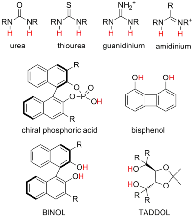 The types of hydrogen-bond donors used in catalysis vary widely from reaction to reaction, even among similar catalytic strategies. While specific systems are often studied and optimized extensively, a general understanding of the optimal donor for a reaction or the relationship between catalyst structure and reactivity is greatly lacking. It is not yet practical to rationally design structures to promote a desired reaction with the desired selectivity. However, contemporary hydrogen-bond catalysis is primarily focused on a few types of systems that experimentally seem to be effective in a variety of situations.[21] These are termed "privileged structures". However, it is worth noting that other structural scaffolds and motifs have also shown promising results, such as metal-coordinated hydrogen-bond donors.[22]