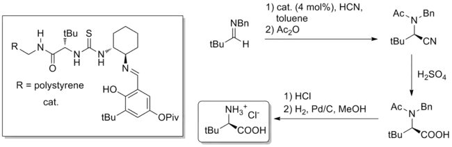 Aside from total synthesis, a potentially useful application of hydrogen-bond catalysis is the bulk synthesis of difficult-to-access chiral small molecules. A notable example is the gram-scale Strecker synthesis of unnatural amino acids using thiourea catalysis, reported in the journal Nature in 2009.[27] The catalyst, whether polymer-bound or homogeneous, is derived from natural tert-leucine and can catalyze (4 mol% catalyst loading) the formation of the Strecker product from benzhydryl amines and aqueous HCN. Hydrolysis of the nitrile and deprotections produces pure unnatural tert-leucine in 84% overall yield and 99% ee.