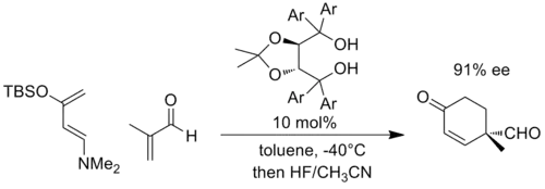 Similarly, negative charge can develop in cycloaddition reactions such as the Diels-Alder reaction, when the partners are appropriately substituted. As a representative example, Rawal and coworkers developed a chiral catalyst based on α,α,α,α-tetraaryl-1,3-dioxolane-4,5-dimethanol (TADDOL) that could catalyze Diels-Alder reactions. In the following example, the reaction with a highly electron-rich diene and an electron-poor dienophile is thought to develop significant negative charge on the enal fragment, and is the transition state is stabilized by increased hydrogen bonding to the TADDOL (Ar = 1-naphthyl).[10]