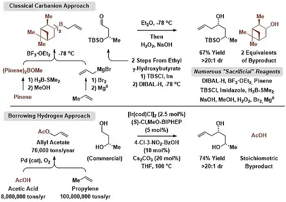 As exemplified by the Krische allylation, dehydrogenation of alcohol reactants can be balanced by reduction of allenes, dienes or allyl acetate to generate allylmetal-carbonyl pairs that combine to give products of carbonyl addition.[3][4] In this way, lower alcohols are directly transformed to higher alcohols in a manner that significantly decreases waste.[25]