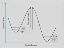 The effects of this energy distribution manifest in the kinetic isotope effect and the equilibrium isotope effect.[45] In a reversible reaction, under equilibrium conditions, the reaction will proceed forwards and backwards, distributing the isotopes to minimize thermodynamic free energy. Some time later, at equilibrium, more heavy isotopes will be on the product side. The stability of the lower energy drives the products to be enriched in deuterium relative to reactants. Conversely, under kinetic conditions, reactions are generally irreversible. The limiting step in the reaction is overcoming the activation energy barrier to reach an intermediate state. The lighter isotope has a higher energy state in the quantum well and will thus be preferentially formed into products. Thus under kinetic conditions the product will be relatively depleted in deuterium.