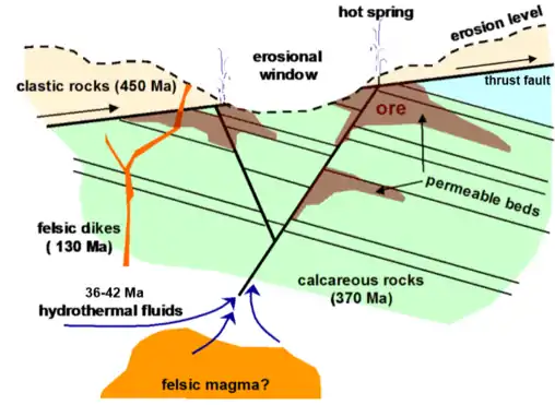 There are two main possibilities for the origin of the ore, both of which are hydrothermal:[29]