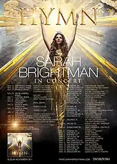 Hymn: Sarah Brightman In Concert is the sixth worldwide concert tour, and tenth tour altogether, by British soprano singer Sarah Brightman in support of her album Hymn (2018). The tour started on 24 November 2018, in São Paulo, Brazil, and will continue until 2021. The event is expected to include 125 shows in five different continents, thus becoming Brightman's largest tour of her career.[1]