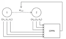 Hypercube-based NEAT, or HyperNEAT,[1] is a generative encoding that evolves artificial neural networks (ANNs) with the principles of the widely used NeuroEvolution of Augmented Topologies (NEAT) algorithm.[2] It is a novel technique for evolving large-scale neural networks using the geometric regularities of the task domain. It uses Compositional Pattern Producing Networks [3] (CPPNs), which are used to generate the images for Picbreeder.org and shapes for EndlessForms.com. HyperNEAT has recently been extended to also evolve plastic ANNs [4] and to evolve the location of every neuron in the network.[5]