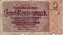 Agriculture Minister Hans Luther proposed a plan that substituted gold for rye and led to the issuance of the Rentenmark ("mortgage mark"), backed by bonds indexed to the market price of gold.[17] The gold bonds were indexed at the rate of 2,790 gold marks per kilogram of gold, the same as the pre-war gold marks. Rentenmarks were not redeemable in gold but only indexed to the gold bonds. The plan was adopted in monetary reform decrees on October 13–15, 1923. A new bank, the Rentenbank, was set up and controlled by new German Finance Minister Hans Luther.