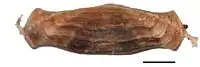 The larval case is 4.1–5.0 millimetres (0.16–0.20 in) in length and 1.2–1.6 millimetres (0.047–0.063 in) wide, smooth with banding that follows the length of the case. Two wide, dark bands form a V-shape that crosses over the central region of the case.