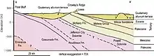 The Chronister family dug the well (which they ultimately abandoned after it was unable to provide enough water) just southwest of their farmhouse, atop a body of limestone. The farmhouse was located near the bottom of a steep valley, sitting atop the remains of a terrace. The layer of clay in which the bones were found was described by Stewart as being 9 feet (2.7 m) thick, situated below 7 feet (2.1 m) of yellow-brown clay and gravel at the surface, and above a dense mass of limestone.[15] Previous interpretations of the site concluded the site to be a minor deposit of clay in a sinkhole; however, aquatic taxa recovered from the deposit, such as the turtle Trionyx, suggest a coastal plain lacustrine environment.[23]