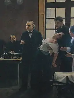 Charcot published over 120 case studies of patients who he diagnosed with hysteria, including Marie "Blanche" Whittman.[19] Whittman was referred to as the "Queen of Hysterics," and remains the most famous patient of hysteria.[19] To treat his patients, Charcot used hypnosis, which he determined was only successful when used on hysterics.[19] Using patients as props, Charcot executed dramatic public demonstrations of hysterical patients and his cures for hysteria, which many suggest produced the hysterical phenomenon.[19] Furthermore, Charcot noted similarities between demon possession and hysteria, and thus, he concluded "demonomania" was a form of hysteria.[4]