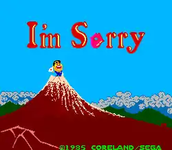 I'm Sorry, known in Japan as Gombe's I'm Sorry (ごんべえのあいむそ〜り〜, Gonbē no Aimusōrī), is a political satire arcade game developed by Coreland and published by Sega in 1985. This action game stars a caricature of former Prime Minister of Japan, Kakuei Tanaka. The title is actually a play on the Japanese word for Prime Minister, Sōri (総理).[2] I'm Sorry was made after the Lockheed bribery scandals, and satirizes Tanaka's greed by making the goal of the game acquiring gold bars.[2] Despite the game's context in Japanese politics, I'm Sorry was localized to United States arcades.