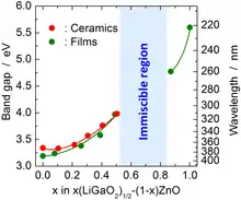 Pure single crystals of β-LiGaO2 with a length of several inches can be grown by the Czochralski method. Their cleaved surfaces have lattice constants that match those of ZnO and GaN and are therefore suitable for epitaxial growth of thin films of those materials. β-LiGaO2 is a potential nonlinear optics material, but its direct bandgap of 5.6 eV is too wide for visible light applications. It can be reduced down to 3.2 eV by alloying β-LiGaO2 with ZnO. The bandgap tuning is discontinuous because ZnO and β-LiGaO2 do not mix but form a Zn2LiGaO4 phase when their ratio is between ca. 0.2 and 1.[2]