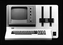 The IBM 5120 Computing System (sometimes referred to as the IBM 5110 Model 3) was announced in February 1980 as the desktop follow-on to the IBM 5110 Computing System. It featured two built-in 8-inch 1.2 MB floppy disk drives, 9-inch monochrome monitor, 32KB RAM and optional IBM 5114 stand-alone diskette unit with two additional 8-inch 1.2 MB floppy disk drives.[1] The system was sold with both APL and BASIC languages in ROM and provided a toggle switch on the front panel to select the language. APL allowed numerous business software written on IBM minicomputers to run on the 5120.[2]