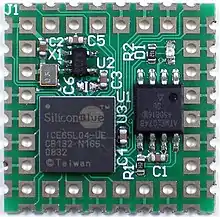 iCE is the brand name used for a family of low-power field-programmable gate arrays (FPGAs) produced by Lattice Semiconductor. Parts in the family are marketed with the "world's smallest FPGA" tagline, and are intended for use in portable and battery-powered devices (such as mobile phones),[1] where they would be used to offload tasks from the device's main processor or system on chip. By doing so, the main processor and its peripherals can enter a low-power state or be powered off entirely, potentially increasing battery life.