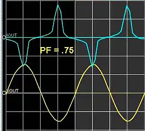 The result of mains rectifiers with connected large value smoothing capacitors is that mains current only flows in the peaks and valleys of the AC wave. Whereas a half cycle of the mains lasts for 10 ms, the mains current flows with large smoothing capacitors for only 3 ms. The result is that high peak currents flow during a short time. The power factor of such rectify and smooth apparatus may be as low as 0.6, and a large number of harmonics (3: 150 Hz), (5: 250 Hz) etc. are generated. This leads to much extra losses in the distribution network, especially in the neutral conductor of a 3 phase distribution network, since the 3rd harmonic of the R, S, and T phase are in phase with each other. The resulting neutral conductor can be larger than the current in each of the phases R, S and T. The sinusoidal wave that the mains voltage should be is distorted and resembled in the days before the harmonic current standard was applicable to electronic apparatus, more a trapezoidal wave: The tops and valleys of the sine wave were flattened.