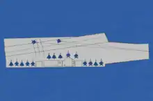 The indigenous aircraft carrier INS Vikrant is 262 metres (860 ft) long and 62 metres (203 ft) wide, and displaces about 45,000 metric tons (44,000 long tons).[26] It features a STOBAR configuration[27] with a ski-jump. The deck is designed to enable aircraft such as the MiG-29K to operate from the carrier. It is expected to carry an air group of up to thirty aircraft, which will include up to 24–26 fixed-wing combat aircraft, primarily the MiG-29K, besides carrying 10 Kamov Ka-31 or Westland Sea King helicopters. The Ka-31 will fulfill the airborne early warning (AEW) role and the Sea King will provide anti-submarine warfare (ASW) capability.[29][30]