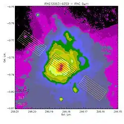 IRAS 12063-6259 is a compact H II region in the constellation of Crux. It lies at a heliocentric distance of roughly 9.5 kpc and a galactocentric distance of 9.3 kpc.[1] Although previously classified as a planetary nebula as well as an H II region, this source is now solely classified as a normal compact H II region, due to its colour criteria,[2] it infrared luminosity, and its spectral content.[3]