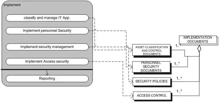 | Implement security management | Specific security requirements and/or security rules that must be met are outlined and documented. The process ends with security policies. | |