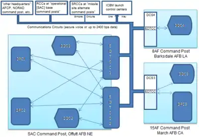 The ITT 465L Strategic Air Command Control System (SACCS, SAC Control System, 465L Project,[1] 465L Program) was a Cold War "Big L"[4] network of computer and communication systems for command and control of Strategic Air Command "combat aircraft, refueling tankers, [and] ballistic missiles".[3] International Telephone and Telegraph was the prime contractor for Project 465,[5] and SACCS had "Cross Tell Links" between command posts at Offutt AFB, March AFB, & Barksdale AFB (SACCS also communicated with the Cheyenne Mountain Complex and Air Force command posts. The 465L System included IBM AN/FSQ-31 SAC Data Processing Systems, Remote (RCC) and Simplex Remote Communication Systems (SRCC), SAC Network Control Office, "4-wire, Schedule 4, Type 4B alternate voice-data operation", and one-way communication with "ICBM launch control centers"[1] (the SAC Digital Network upgraded to two-way communications.) In addition to IBM for the "Super SAGE type computers", another of the 6 direct subcontractors[5] was AT&T ("end-to-end control" of the communications circuits),[1]