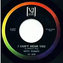 The Betty Everett version was released in the summer of 1964 as the follow-up to her top ten song "The Shoop Shoop Song". Robert Pruter in his book Chicago Soul describes "I Can't Hear You" as a "surprisingly weak [song] for Goffin-King that did not give the Vee Jay [Records] staff [musicians] much to work with" and dismisses Everett's single with its number 39 R&B chart (as reported in Cash Box magazine) as "essentially a non-hit."[1] "I Can't Hear You" appeared on the Billboard Hot 100 with a peak of number 66,[2] and number 85 on the Cash Box Pop 100.