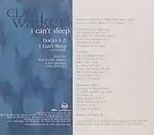 "I Can't Sleep" is a song co-written and recorded by American country music singer Clay Walker. It was released in January 2004 as the second single from his album A Few Questions, it peaked at #9 on the Hot Country Singles & Tracks (now Hot Country Songs) chart, and features Chely Wright (with whom Walker co-wrote the song) on background vocals.