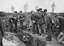 Pre-war planning for the British Expeditionary Force (BEF) did not envisage any intermediate headquarters between GHQ and the six infantry divisions, but it was assumed that if corps HQs became necessary, then the GOC Aldershot Command would automatically become GOC I Corps in the field.[13] On mobilisation in August 1914 the decision was made to conform to the two-division army corps organisation employed by the French armies alongside which the BEF was to operate.[14] Sir Douglas Haig, then commanding at Aldershot, therefore took I Corps HQ to France with 1st Division and 2nd Division under command, and it remained on the Western Front throughout the war. It had a peripheral part at the Battle of Mons, then saw hard fighting at the Battle of the Aisne and First Battle of Ypres in 1914, at the Battle of Aubers Ridge in the Spring of 1915 and alongside the Canadian Corps at the Battle of Hill 70, as well in many other large battles of the First World War.