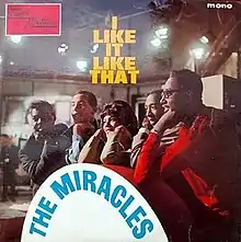 I Like It Like That is an album by Motown group the Miracles, compiled for the UK market and released on the UK Tamla-Motown label (TML11003) as one of its initial group of six albums in March 1965 (there was no equivalent album to this in the USA). Known as the Miracles' "forgotten album", few people, outside of Motown insiders, hard-core Miracles fans, and collectors, remember that it had even existed. This album featured a combination of several new-for-1964 songs along with previously issued material from the group's album from the year before, The Miracles Doin' Mickey's Monkey. New for 1964 songs included "I Like It Like That" (the Top 30 title song), the Bobby Rogers-led flip side "You're So Fine and Sweet,"(this is the only original Miracles studio album that has that song), "That's What Love Is Made Of", another 1964 hit that the group performed on the American International Pictures release, the T.A.M.I. Show that year, and "Would I Love You", a song that became a popular regional hit tune for the group in Pennsylvania and The Midwest. The album also featured a Claudette Robinson-led cover version of the Orlons' #2 Pop smash, "The Wah-Watusi". (Claudette is also featured with the rest of the group on the album's cover), and the group's 1963 Top 40 Hit, "I Gotta Dance to Keep From Crying". Several of the group's other 1964 songs, including the chart hits "(You Can't Let the Boy Overpower) The Man in You", "Come On Do the Jerk", and its "B" side, "Baby Don't You Go", were not included. The new 1964 recordings "I Like It Like That", "Would I Love You" and "That's What Love Is Made Of" were included on the only US Miracles 1964 album release "Miracles Greatest Hits From The Beginning" which was the first double album released by Motown Records.