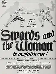 I Will Repay is a 1923 British silent period film[1] directed by Henry Kolker and starring Holmes Herbert, Flora le Breton, and Pedro de Cordoba.[2] It was based on the 1906 novel I Will Repay by Emma Orczy, which is a sequel to The Scarlet Pimpernel (part of a large series of such novels). It was released in the United States under the alternative title Swords and the Woman.[3]