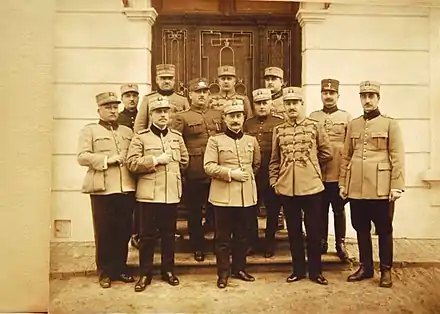 From 1896 to 1898, Zadik also studied at the Higher War School. He steadily rose through the ranks, becoming an army officer in 1901.[16] His son was born in Bucharest on March 27, 1898, following his father's career choices by enlisting for the army school at Dealu Monastery.[17] As a Lieutenant Colonel, Zadik Sr was assigned to the 1st Infantry Division in Craiova, and later to the 7th Division in Roman.[13] In the latter capacity, he was involved in repressing the Romanian Peasants' Revolt, organizing interrogations of officers who "have been in contact with the rebels".[18] Zadik first saw action abroad during the Second Balkan War (1913).[19] He became Colonel, and was assigned to the Staff of the 3rd Army Corps in Galați, shortly before World War I; in October 1914, he was moved to the 4th Army Corps in Iași.[13] In 1915–1916, he went on a mission to Joseph Joffre, commander of the French Army on the Western Front.[20]