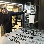 His process involves cutting, stitching, and gluing various shades of denim to provide contrast and shadow.[15][25][26][27] Even at touching distance, many viewers don't realise that they are looking at many layers, and shades, of denim jeans.[28] Many people compare it to Photorealism, but just with denim, not paint,[29][30][31][32][33] 'your first impression is that of an indigo coloured oil painting, or a photograph in blue.'[33][34][10]
