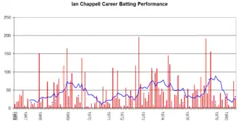 He retained his place for the following Test and for the tour of South Africa in summer 1966–67. Playing in a side defeated 1–3, Chappell struggled to make an impression. His highest score in ten Test innings was 49, while his five wickets cost 59 runs each.[22] On the advice of Simpson, he ceased playing the hook shot as it was often leading to his dismissal.[23] In the first Test of 1967–68 against India, he failed twice batting in the middle order. Heading into the second Test at Melbourne, Chappell's place was in jeopardy, but he rode his luck to score 151 – his innings contained five chances that the Indians failed to take.[19] However, in the remainder of the series, he managed only 46 runs in four innings,[24] so his selection for the 1968 tour of England was based as much on potential as form.