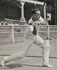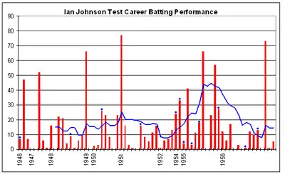 Jack Pollard described Johnson as a "dour middle order batsman".[99] He had a sound defence and when necessary could hit the ball with power.[101] Bradman was full of praise for Johnson's batting after the Invincibles tour in 1948: "Splendid batsman—most valuable about number 7", also describing him as a "very good slip field".[102]