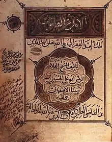Much known of al-Nadim is deduced from his epithets. 'Al-Nadim' (النَّدِيم), 'the Court Companion' and 'al-Warrāq (الْوَرَّاق) 'the copyist of manuscripts'. Probably born in Baghdad ca. 320/932 he died there on Wednesday, 20th of Shaʿban A.H. 385. He was a Persian or perhaps an Arab.[2][3] From age six, he may have attended a madrasa and received comprehensive education in Islamic studies, history, geography, comparative religion, the sciences, grammar, rhetoric and Qurʾanic commentary. Ibrahim al-Abyari, author of Turāth al-Insaniyah says al-Nadim studied with al-Hasan ibn Sawwar, a logician and translator of science books; Yunus al-Qass, translator of classical mathematical texts; and Abu al-Hasan Muhammad ibn Yusuf al-Naqit, scholar in Greek science.[7] An inscription, in an early copy of al-Fihrist, probably by the historian al-Maqrizi, relates that al-Nadim was a pupil of the jurist Abu Sa'id al-Sirafi (d.978/9), the poet Abu al-Faraj al-Isfahani, and the historian Abu Abdullah al-Marzubani and others. Al-Maqrizi's phrase 'but no one quoted him', would imply al-Nadim himself did not teach.[8] While attending lectures of some of the leading scholars of the tenth century, he served an apprenticeship in his father's profession, the book trade. His father, a bookdealer and owner of a prosperous bookstore, commissioned al-Nadim to buy manuscripts from dealers. Al-Nadim, with the other calligrapher scribes employed, would then copy these for the customers. The bookshop, customarily on an upper floor, would have been a popular hangout for intellectuals.[9]