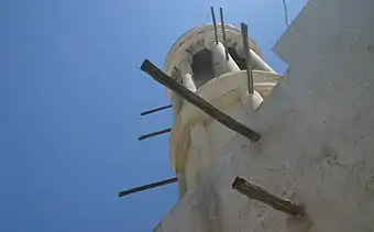 Outside the majlis, a verandah runs along the length of the building, with four serrated archways and columns to its exterior. As well as teak beams, mangrove poles supported the roof, with woven barasti, palm fronds, packing the ceiling space. The building itself is of gypsum and coral, the latter keeping the walls porous and breathable, while wind scoops in the walls helped to ventilate the space. The courtyard of the majlis was shaded by a large tree that the family would sleep around in the hot summer months.[1] The house was abandoned in the 1970s until it was renovated and opened to the public as a museum in 1996,[6] prior to the construction of the Al Bait Hotel, which incorporates the Bait Al Midfa and three other merchants' houses into its structure. Two of Al Midfa's brothers' houses also form part of the hotel building - Bait Eissa Al Midfa forms the hotel reception and Bait Abdul Rahman Al Midfa has become the Heritage guestroom block.[7]
