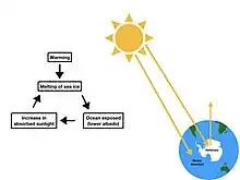 Ice–albedo feedback is a positive feedback climate process where a change in the area of ice caps, glaciers, and sea ice alters the albedo and surface temperature of a planet. Ice is very reflective, therefore some of the solar energy is reflected back to space. Ice–albedo feedback plays an important role in global climate change.[1] For instance, at higher latitudes, warmer temperatures melt the ice sheets.[2] However, if warm temperatures decrease the ice cover and the area is replaced by water or land, the albedo would decrease. This increases the amount of solar energy absorbed, leading to more warming.[3] The effect has mostly been discussed in terms of the recent trend of declining Arctic sea ice.[4] The change in albedo acts to reinforce the initial alteration in ice area leading to more warming. Warming tends to decrease ice cover and hence decrease the albedo, increasing the amount of solar energy absorbed and leading to more warming. In the geologically recent past, the ice–albedo positive feedback has played a major role in the advances and retreats of the Pleistocene (~2.6 Ma to ~10 ka ago) ice sheets.[5] Inversely, cooler temperatures increase ice, which increases albedo, leading to more cooling.