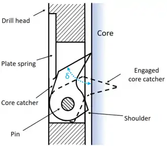 To retrieve a core, an annulus of ice must be removed from around the cylindrical core.[56] The core should be unbroken, which means that vibrations and mechanical shocks must be kept to a minimum, and changes in temperature which could cause thermal shock to the core must also be avoided.[57] The core must be kept from melting caused by heat generated either mechanically from the drilling process,[58] from the heat of compressed air if air is used as the drilling fluid,[34][35] or from a thermal drill, and must not be contaminated by the drilling fluid.[42] When the core is about to be retrieved, it is still connected to the ice beneath it, so some method of breaking it at the lower end must be provided, and of gripping it so it does not fall from the core barrel as it is brought to the surface, which must be done as quickly and safely as possible.[49]