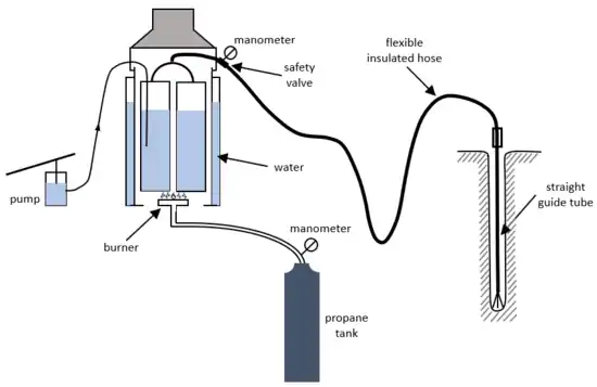 Steam can also be used in place of hot water, and does not need to be pumped. A handheld steam drill is able to rapidly drill short holes, for example for ablation stakes, and both steam and hotwater drills can be made light enough to be hand carried.[30] A guide tube can be used to help keep the borehole straight.[122]