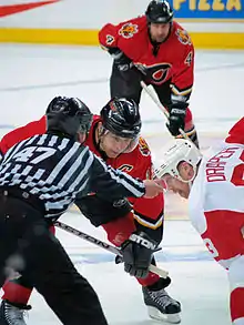 Jarome Iginla and Kris Draper of the Detroit Red Wings taking a faceoff in the 2006 playoffs