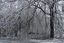 An ice storm is a type of winter storm characterized by freezing rain, also known as a glaze event or, in some parts of the United States, as a silver thaw.[1] The U.S. National Weather Service defines an ice storm as a storm which results in the accumulation of at least 0.25-inch (6.4 mm) of ice on exposed surfaces.[2] They are generally not violent storms but instead are commonly perceived as gentle rains occurring at temperatures just below freezing.