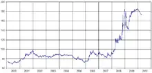 In October 2008, the financial crisis of 2007–2008 brought about a collapse of the Icelandic banking sector. The value of the Icelandic krona dropped, and on 7 October 2008 the Icelandic Central Bank attempted to peg it at 131 against the euro.[10] This peg was abandoned the next day.[11] The krona later dropped again and to 340 against the euro before trade in the currency was suspended[12] (by comparison, the rate at the start of 2008 was about 90 krona to the euro[13]). After a period of tentative, very low-volume international trading in the krona, activity had been expected to pick up again throughout November 2008, albeit still with low liquidity, as Iceland secured an International Monetary Fund loan.[14] However, as of January 2009 the krona was still not being traded regularly, with the European Central Bank (ECB) reference rate being set only intermittently, the last time on 3 December 2008 at 290 krona per euro.[15]