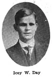 Icey Wiley Day was born on July 1, 1891, in Ethel, Attala County, Mississippi.[1] His parents were John Vandiver Day and Anne Elizabeth (Wilson) Day.[1] He was blinded at the age of 10 while playing baseball in Ethel.[2] At the age of 13, he entered the State Institution for the Blind in Jackson, Mississippi, and remained there until he was 19.[1] He then entered the University of Mississippi, where he received his L.L.B. in 1913.[1] He was admitted to the bar the same year.[1]