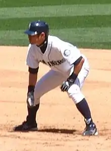 On 29 July 2007, Ichiro collected his 1,500th U.S. hit, the third fastest to reach the MLB milestone behind Al Simmons and George Sisler.[44] Ichiro had 213 hits in 2008, his eighth straight 200-hit season. This tied the 107-year-old record set by Wee Willie Keeler. Typically, Ichiro was among baseball's leaders in reaching base on an error (14 times in 2008, more than any other batter in the AL), and in infield hits (his 56 were the most in the majors).[45] Ichiro has amassed more than 450 infield hits in his U.S. career. Detroit third baseman Brandon Inge told The New York Times, "I wish you could put a camera at third base to see how he hits the ball and see the way it deceives you. You can call some guys' infield hits cheap, but not his. He has amazing technique."[46] In May 2008, Ichiro stole two bases, giving him a career total of 292, surpassing the previous Seattle Mariners team record of 290 set by second baseman Julio Cruz. Cruz, who now does Spanish-language broadcasts of Mariners games, was watching from the broadcast booth as Ichiro broke his record.[47][48]