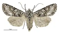 ♀. 42 mm. Head, palpi, thorax fuscous mixed whitish and blackish. Forewings elongate-triangular, termen obliquely rounded, waved; grey, irrorated blackish and whitish; a small white spot in middle of base; lines white, blackish-edged, waved, subbasal curved, first rather irregular, slightly bent on fold, second sinuate, subterminal parallel to termen, slightly indented near extremities; median band darker grey irrorated blackish, without white irroration, median shade obscurely blackish, dentate; spots outlined white and then blackish, claviform small, wedged-shaped, resting on first line, orbicular rather oblique, oval, reniform narrow slightly bent in middle : cilia grey narrowly barred white. Hindwings grey; cilia light grey, slenderly barred whitish, outer half whitish.[3]
