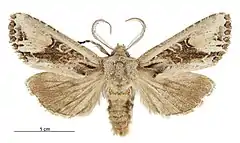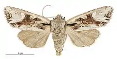 Ichneutica scutata is a moth of the family Noctuidae.[1] It is endemic to New Zealand. This species can be found in the southern parts of the North Island as well as the eastern parts of the South Island. It is similar in appearance to I. insignis and I. skelloni but can be distinguished as I. scutata is much paler in appearance. It is likely this species inhabits lowland tussock grasslands as well as coastal dunes although it is not common in inland tussock grasslands. The larvae feed on a variety of herbaceous plants such as Plantago and Convolvulus species, Plagianthus divaricatus. It pupates on soil near its host plants. The adults are on the wing from late March to July.