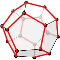One possible Hamiltonian cycle through every vertex of a dodecahedron is shown in red – like all platonic solids, the dodecahedron is Hamiltonian