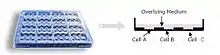 The IdMOC plate consists of multiple inner wells within a large interconnecting chamber. Multiple cell types are first individually seeded in the inner wells and, when required, are flooded with an overlying medium to facilitate well-to-well communication. Test material can be added to the overlying medium and both media and cells can be analyzed individually. Plating of hepatocytes with other organ-specific cells allows evaluation of drug metabolism and organotoxicity.[1]