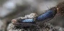 Idiothele mira,[1] also known as the blue-foot baboon or the trap-door tarantula, is a species of tarantula endemic to South Africa and is popularized by hobbyists for the striking blue coloration on the ventral side of the tarsi and metatarsi on each leg.[2] Furthermore, the species is well known for belonging to one of two described genera of theraphosids that build a trapdoor, the other being Typhochlaena.[3]