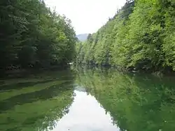 The river basin has an area of 598 square kilometres (231 sq mi).[1] The major tributaries are the Belca, Zala, Cerknica, and Bača from the right and the Nikomlja, Kanošica, and Trebušica from the left. One of the right tributaries is also the Jezernica River, which originates from the Wild Lake (Slovene: Divje jezero). Being only 55 m long, the Jezernica is the shortest river in Slovenia.