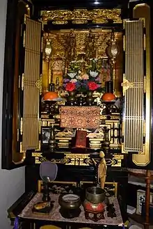 Today all households are obligated to record their information in the koseki, the family registration system,[5] which records any and all changes in family composition and identity.[6] The koseki also requires a household to appoint one person as the head of the house.[7] Although a woman may also be head of household, the heads are typically male (98 percent of households elect a male as the head of the household).[8] Once the head is chosen, other members of the house must change their surnames to that of the head. Japanese law obligates married spouses to have the same surname. Although the chosen surname can be of the wife too, this rarely happens. In 2015, the Japanese Supreme Court upheld the constitutionality of the law, noting that women could use their maiden names informally, and stating that it was for the legislature to decide on whether to pass new legislation on separate spousal names.[9] Even with the death of a koseki, the family will keep the name as long as they are listed in the system as part of his koseki. One to two generations can be included in a koseki, a couple and their children. If a household consists of grandparents and children, then the grandparents must start to have their own koseki. This system has been noted to be particularly strict in that it excludes any families who do not fit into the patrilineal structure encouraged by the koseki. Another important aspect of the ie is the role of dead ancestors. Dead ancestors may be separated into two categories: the "generation dead", and the "juvenile dead." "Generation dead" are husband and wife pairs who held the status of household heads during their living years. These ancestors are representative of the history of the ie and provide living members of the ie means of relating to their history and ancestors. They play a pivotal role in the daily lives of most Japanese households in that they must be given a great deal of respect and are commemorated through Buddhist rites. In contrast, if an ancestor does not qualify as a "generation dead" then they are considered "juvenile dead" and are destined to be forgotten.